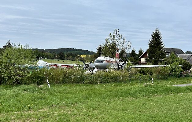 Nejdřív jsem myslel, že jsem toho moc vypil. Představte si, že si takhle jdete polní cestou na Česko-něměckém pomezí a nejednou zahlédnete v poli starý dopravní Iljušin. Vůbec jsem nevěděl, co si mám myslet. Za chvíli jsme ovšem přišli k restauraci Gaststätte am Flugzeug. Jsou tam ještě další menší letadla a dětské hřiště. Majitel hostince je asi sběratel. Dali jsme si jen pití, takže jak vaří, nevíme. Opravdu nevšední zážitek. Odtud začíná již cesta klesat k přehradě.
