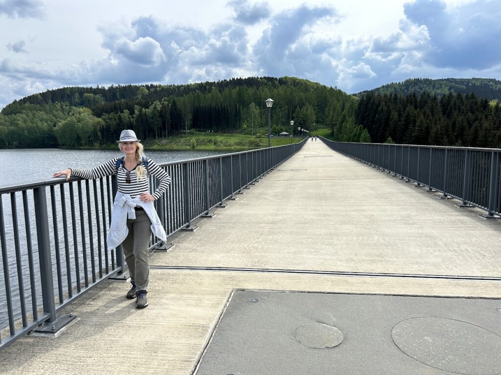 O Českém Jiřetíně jsme psali na našich stránkách tady. Tentokrát za hraničním můstkem nepůjdeme doprava, ale rovně po červené turistické značce, která začne brzo stoupat k vesničce Cammerswalde. Cestou se otevírají krásné výhledy nejen na přehradu, ale i okolní kopce a rozhledny. Je to kraj, kde sice moc lidí nepotkáte, ale turistická infrastruktura se buduje již od konce 19. století. Před vesničkou odbočíme, pořád po červené, doleva a pokračujeme po širší asfaltové cestě. Mineme docela luxusní turistický přístřešek.