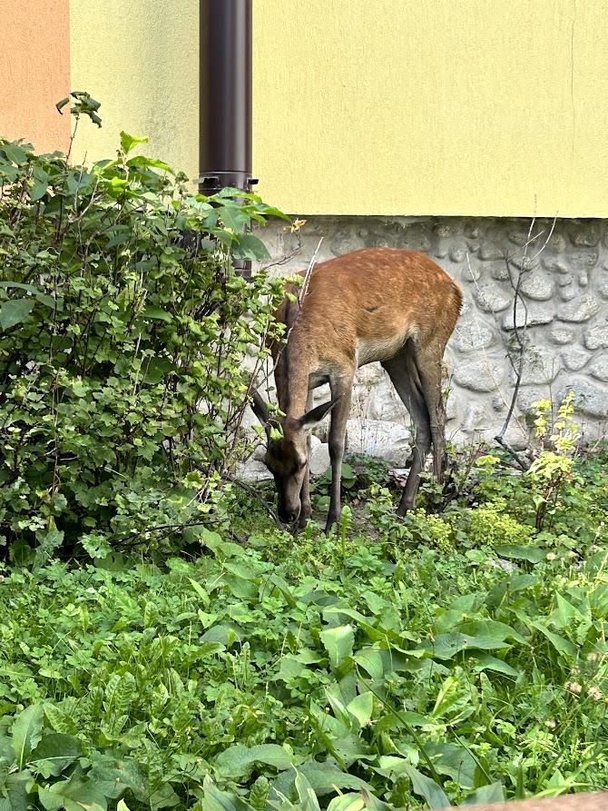 Tentokrát začínáme trasu u Grandhotelu Praha, kde jsme byli ubytováni. Mimochodem jedná se o zařízení, kde jsme také dobře jedli a užívali si wellness. Cestou dolů do centra Tatranské Lomnice jsme prošli příjemným parkem. Minuli jsme romantické nádražíčko a pokračovali dále městem. Docela jsme byli překvapeni, že se zde u jednoho z paneláků pásl kopytník bez toho, že by ho jakkoliv vzrušovala naše přítomnost, jak se můžete přesvědčit v galerii fotek. Pro městského člověka docela unikátní zážitek.