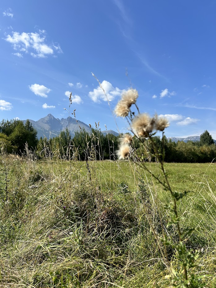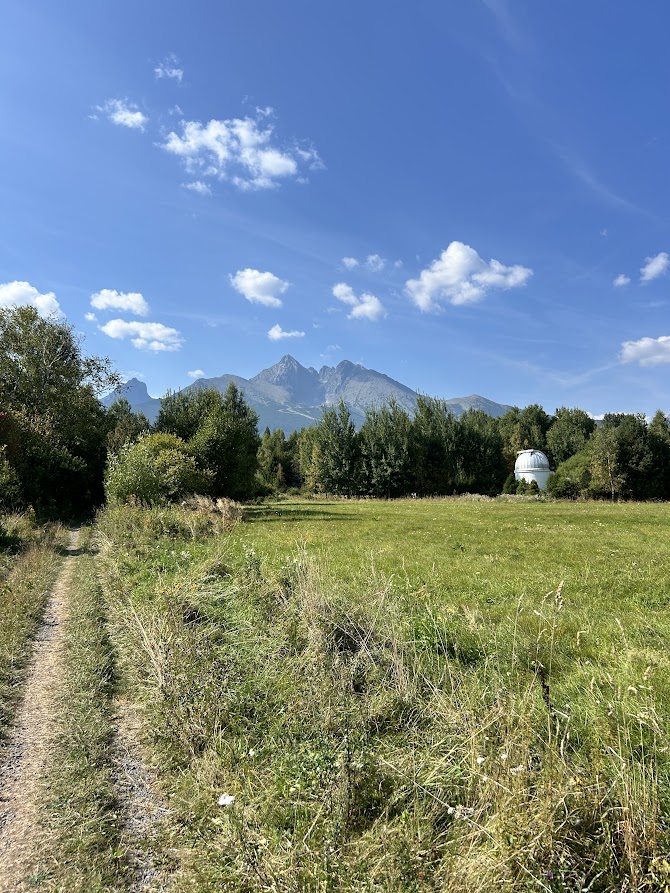 Poté cyklostezka 5879 prudce zahýbá mezi domy a do lesa. Pokračovali jsme příjemnou lesní pěšinou až k Observatoři Stará Lesná. Poté jsme z lesa vyšli a pokračovali typickou prašnou polní cestou. Byla ovšem příjemná a při pohledu zpět jsme pozorovali otevírající se výhledy na celou jednu část Vysokých Tater. Viděli jsme zejména Lomnický štít a Slavkovský štít. Panorama to bylo opravdu krásné. Stejně krásné panorama Nízkých Tater jsme pozorovali před sebou. Tatry jsme měli jako na dlani.