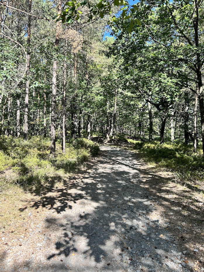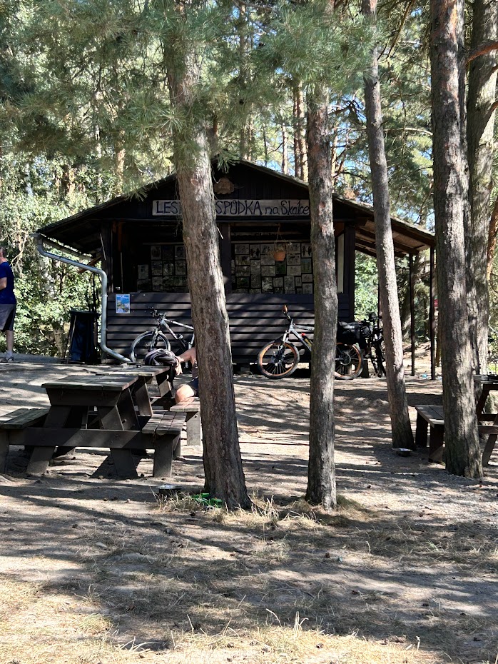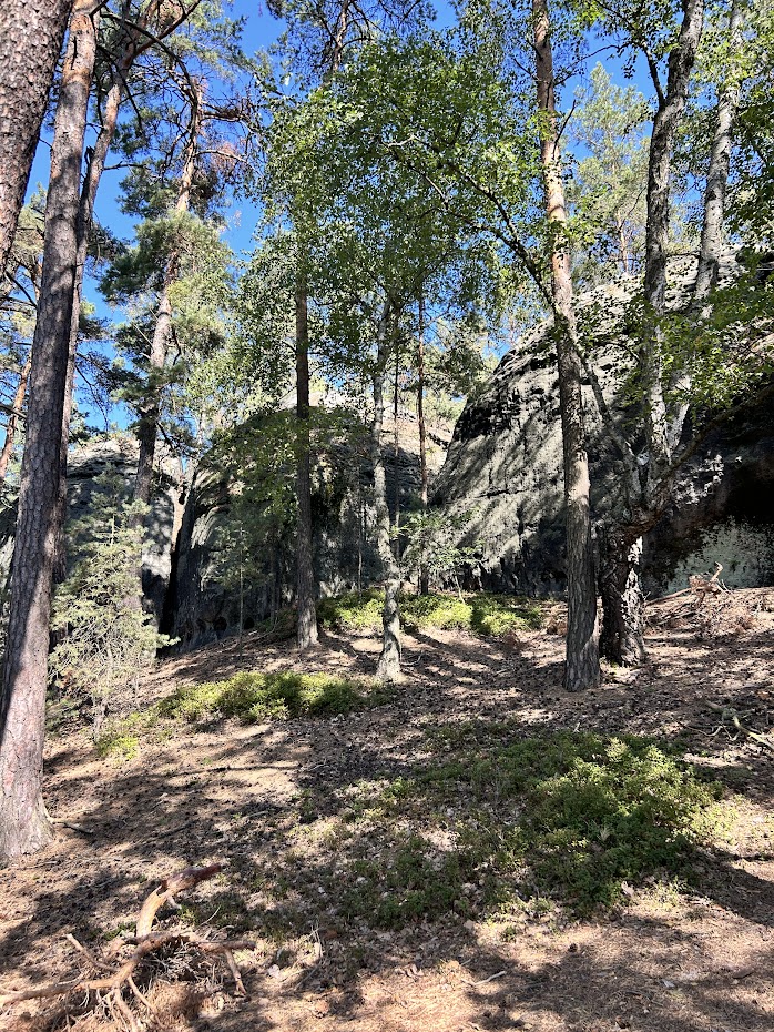 My budeme pokračovat přes vesnici po modré, až skoro na její konec. Tam odbočíme doprava a kolem lesní hospůdky Na Skalce vcházíme do lesa. Tato část působí přímo mediteránním dojmem. Měli jsme pocit, že jsme v lese někde v Chorvatsku. Zřejmě je to tím, že podloží je pískovcové, rostou tam borovice a je sucho.