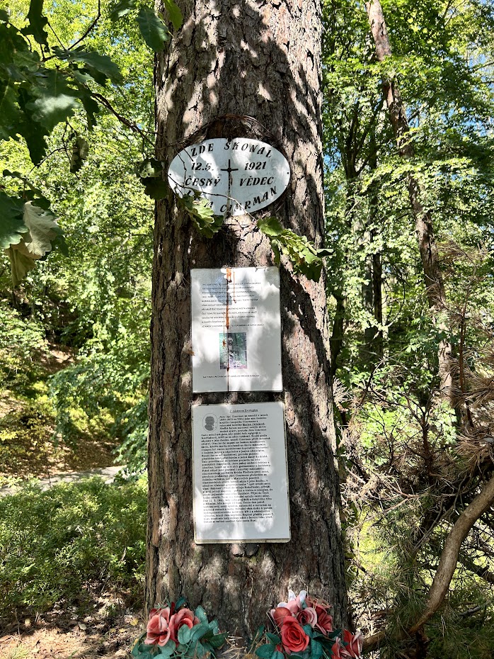 Po chvíli jsme došli na místo, kde je pomník Járy Cimrmana. Vedle je také docela velký zachovalý přístřešek. Červená značka se tady napojuje zpátky na cyklostezku.