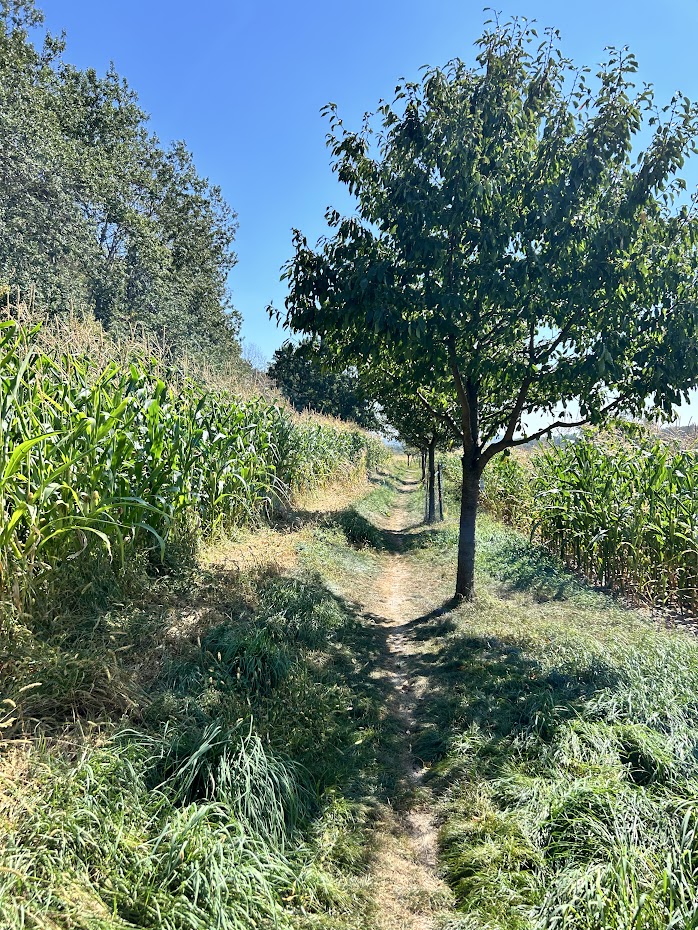 Po několika minutách jsme dorazili k rozcestníku U Martinské stěny. Odbočili jsme na žlutou a pokračovali z kopečka. Po několika stovkách metrů tady krajina úplně změní ráz. Vyšli jsme na kukuřičné pole. Pěšina je úzká, trochu zarostlá a pocitově opravdu dlouhá. Když jsme šli, bylo opravdu vedro a cesta nám dala trochu zabrat. Byli jsme jednoduše jako ve výhni.