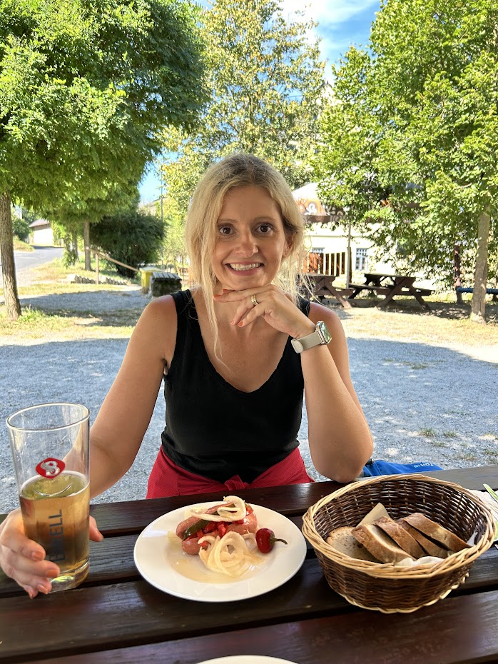 Za malou chvilku se cesta napojí na silnici vedoucí do vesničky Dřevčice. Tam jsme poseděli v podniku pod jménem „Hospůdka Dřevčice“. Jak prozaické. Žádné vymýšlení zbytečných názvů. Byla to jediná možnost občerstvení po těch 7 kilometrech. Měli výborné utopence. Po utopencích, pivu a odpočinku jsme šli zpět stejnou cestou.