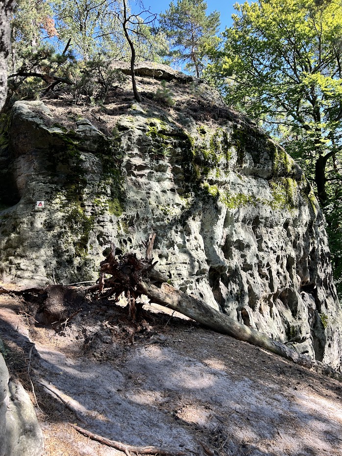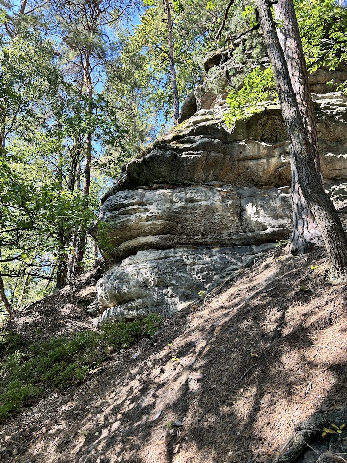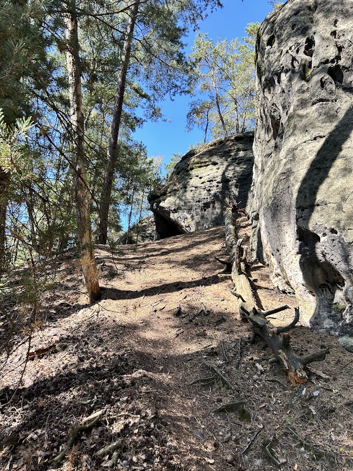Když mineme rozcestník, cesta se příjemně vine dál lesem. Je dostatečně široká, je značená i jako cyklostezka 0058. Procházeli jsme tudy v září a žádného cyklistu si ovšem nepamatuji. Jakmile červená značka odbočí z uvedené cyklostezky, stává se z ní úzká pěšinka. Charakter okolního lesa je také trochu jiný. Okolní skály jsou tak nějak víc bezprostřední.
