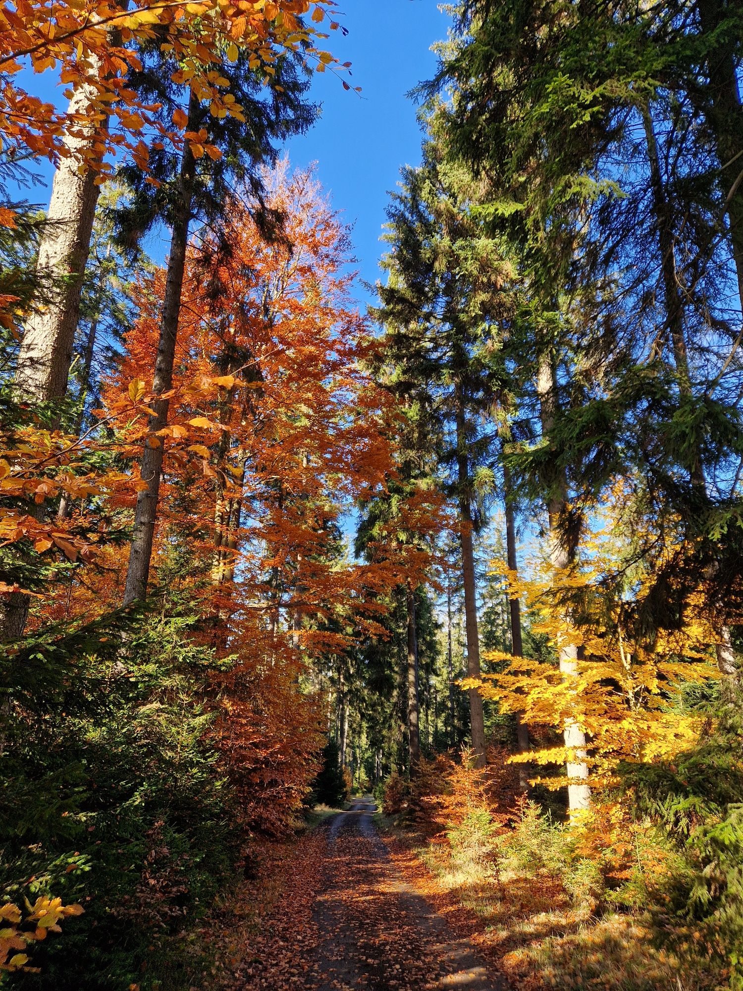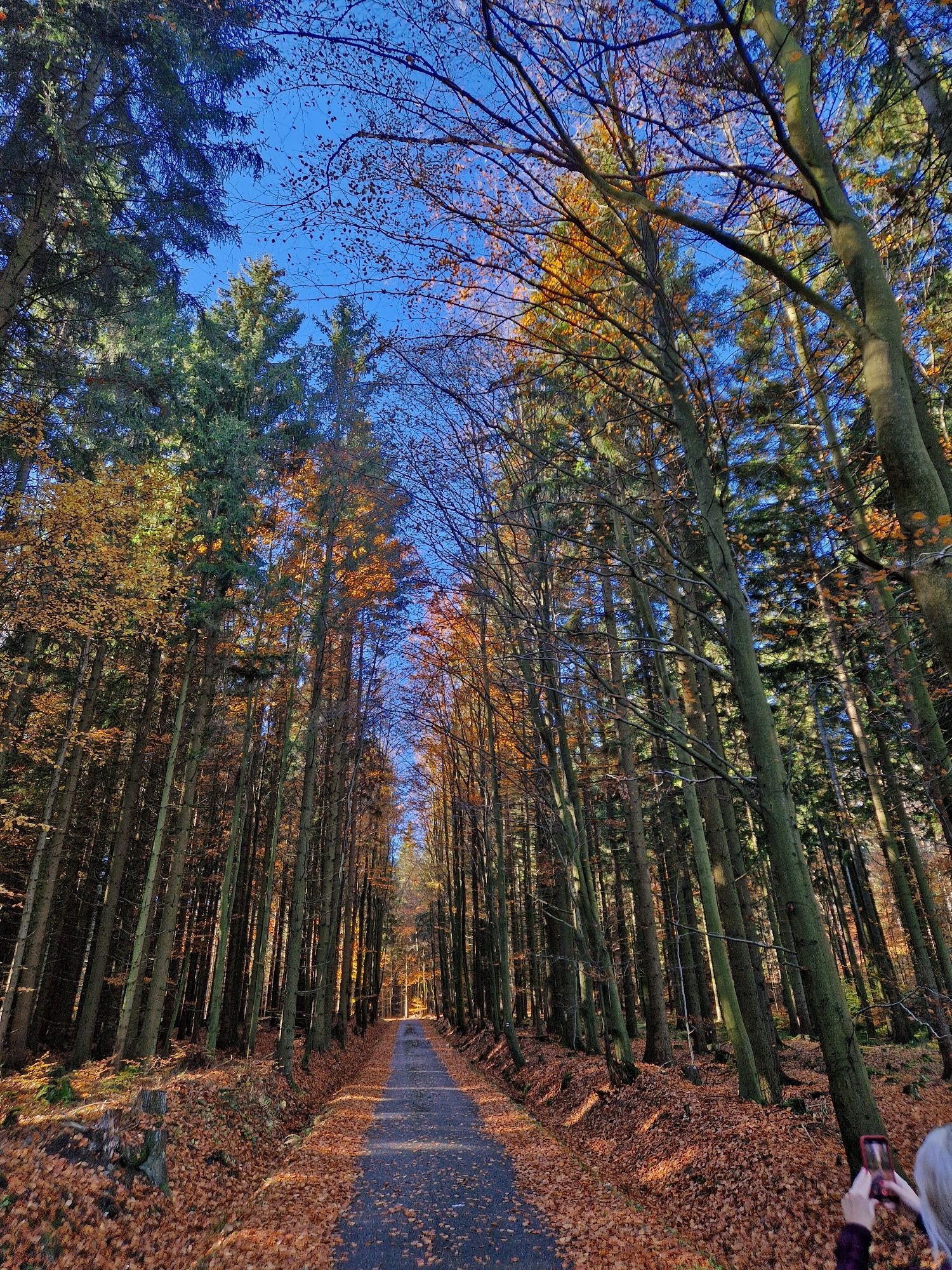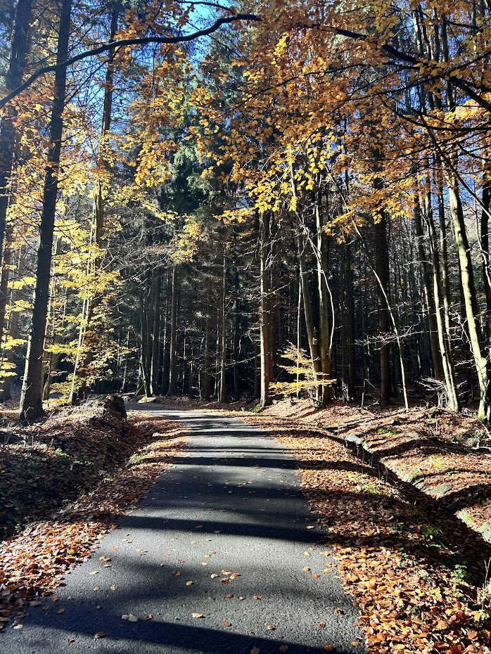 Z hradu sestoupáme po kamenném poli – pozůstatcích opevnění – na příjemnou lesní pěšinu. Ta je opravdu hezká a šlo se nám po ní opravdu dobře. Na křižovatce s širší lesní cestou jsme se rozhodli opustit žlutou značku. A pokračovat po asfaltce. Je to ovšem jedno. Vzdálenost je zhruba stejná. Pak už jsme šli mírným klesáním až na parkoviště.