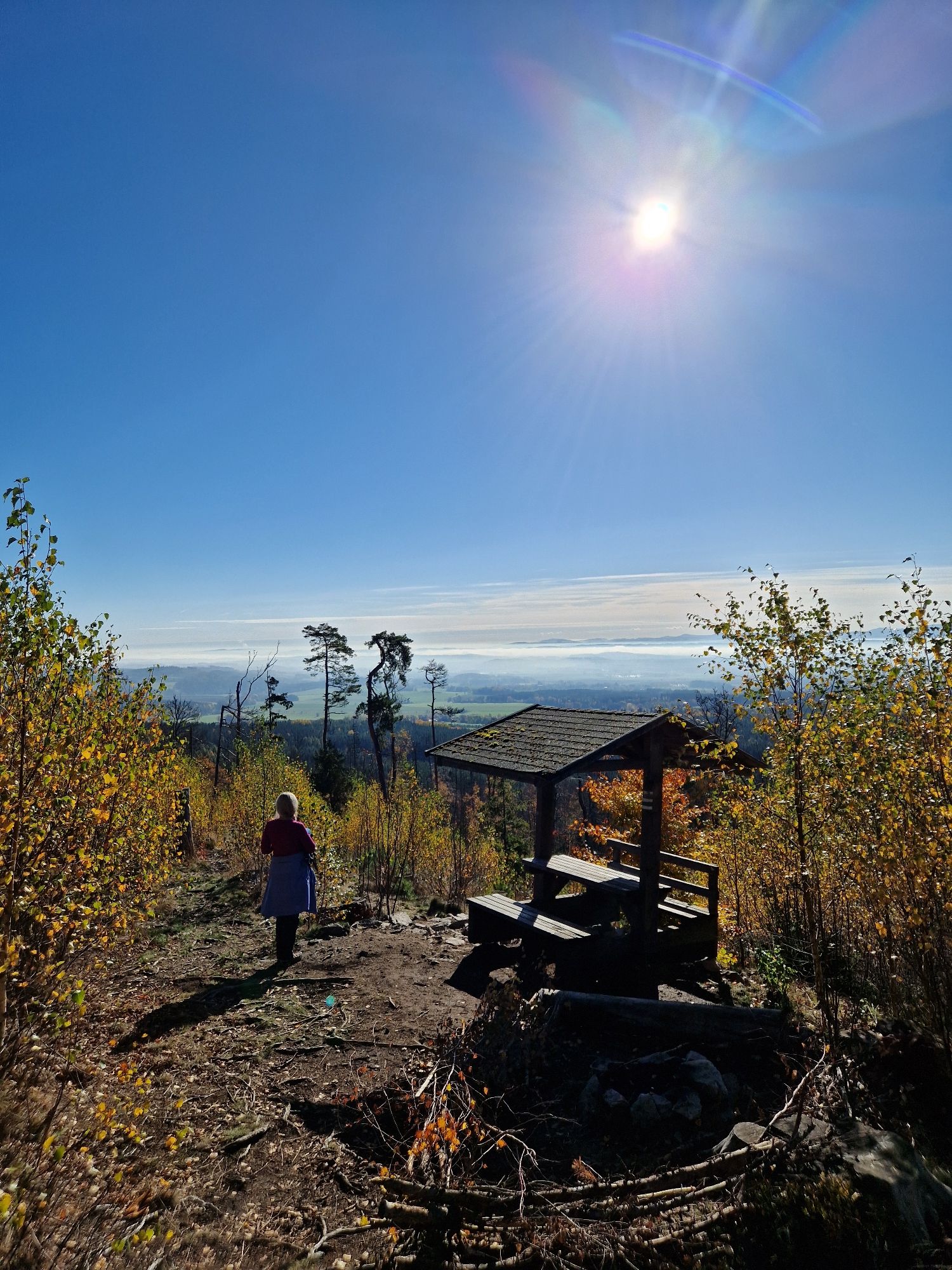 Na vyhlídce stojí dřevěné odpočívadlo. Můžete si tady dát občerstvení a kochat se výhledem. Byl jeden z nejlepších, jaké jsem letos viděl. Hlavně byl tak trochu nečekaný. Jasně, že jsem čekal, že z kopce něco uvidím. Tohle ovšem ne. Předčilo to veškerá má očekávání. Asi tam chodil i známý autor České mše Vánoční J. J. Ryba. Výhled je to stejně impozantní, jako jeho nejznámější skladba. Strávili jsme tam docela dost času. A byli jsme sami, což mě dost překvapilo. V létě tam bude asi víc lidí.