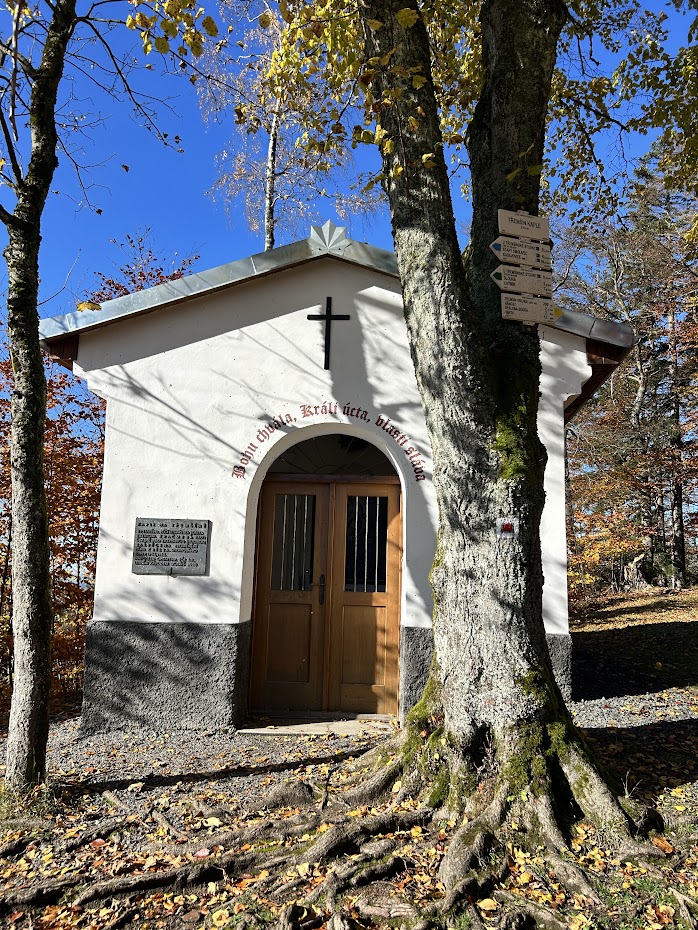 Po vystoupání ke kapli Proměnění Páně z roku 1771 se nám otevřela opravdu nádherná vyhlídka směrem k Písku, Strakonicím a Klatovům. Samotná barokní kaplička byla zavřená. Byla opravdu hezká viditelnost, tak jsme viděli až na Šumavu. Vzdušnou čarou je to skoro 60 km.