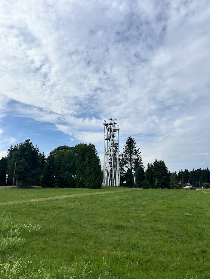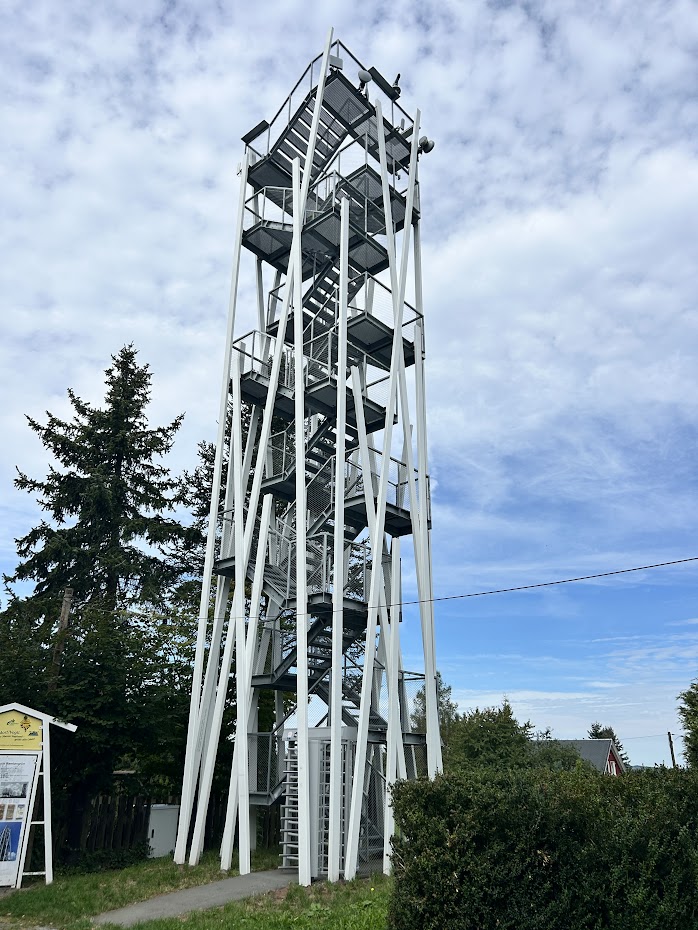 Této vesničce vévodí moderní rozhledna. Nevím, jak je to možné, ale na konci 19. století se evidentně stavěli rozhledny, co měl vydržet (a vydrželi) mnoho desítek let. Všechny moderní rozhledny, asi stavěné z peněz EU jsou postaveny tak, že za pár let zřejmě zrezaví a spadnou. Navíc jsou dělány z roštových podlah, takže vidíte pod sebe. Což spoustu lidí bohužel odradí od návštěvy. Takže průhledné rozhledny nejsou jen v Česku.