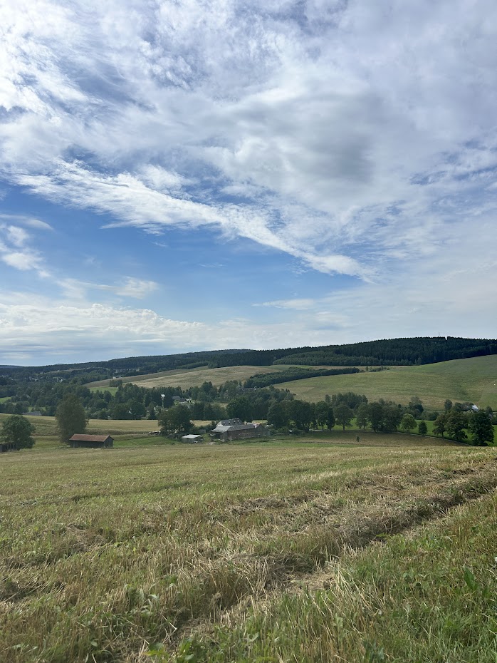 Tentokrát vyrážíme z autobusového nádraží ulicí vedoucí nad supermarketem a pokračujeme kousek ke křižovatce, kde odbočíme vlevo a začínáme stoupat do docela prudkého kopce. To už jdeme po souběhu červené a zelené značky. Z městečka odbočíme vpravo a jdeme po hezké rovné polní cestě, ze které jsou výhledy na obě strany. U vstupu do lesa se už držíme červené značky a dojdeme do vesničky Sträßel. Tou projdeme a po úzké silnici dojdeme do obce Remtengrün. Všechny vesničky a města v oblasti jsou čisté a upravené. Příjemná změna.
