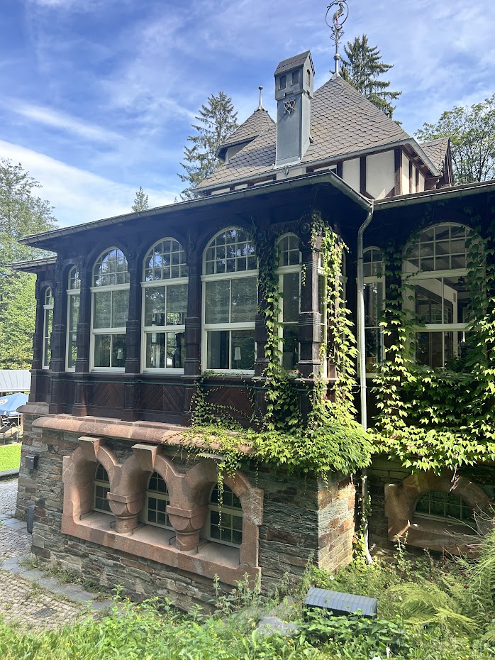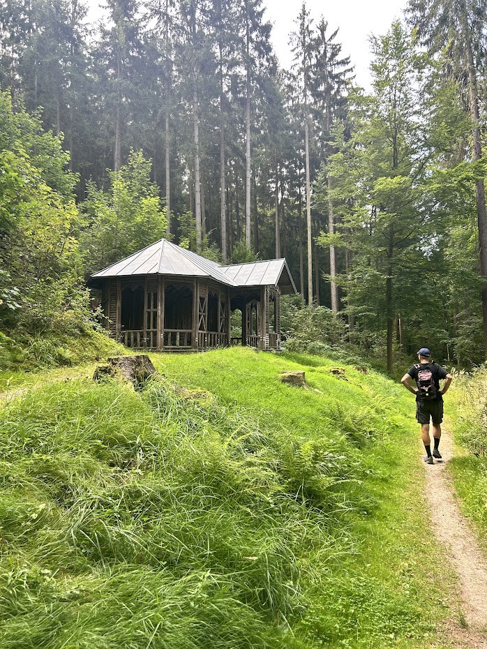 Od nádražní budovy pokračujeme vlevo nahoru po zelené značce Bahnhofsweg. Je již vidět, že jde o lázeňskou cestu přírodou. Podobných stezek je hodně v Karlových Varech. Po pár stovkách metrů je vlevo krásný zachovaný dřevěný historický altán. Cesta kdysi byla asi hodně využívaná k nádraží, než postavili novou silnici ležící v údolí. Stezka vede příjemně po vrstevnici a za chvíli dojdeme k výletní restauraci Waldquelle.