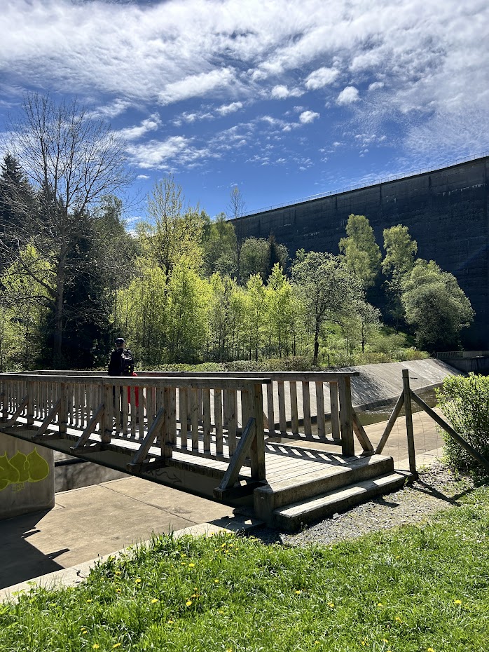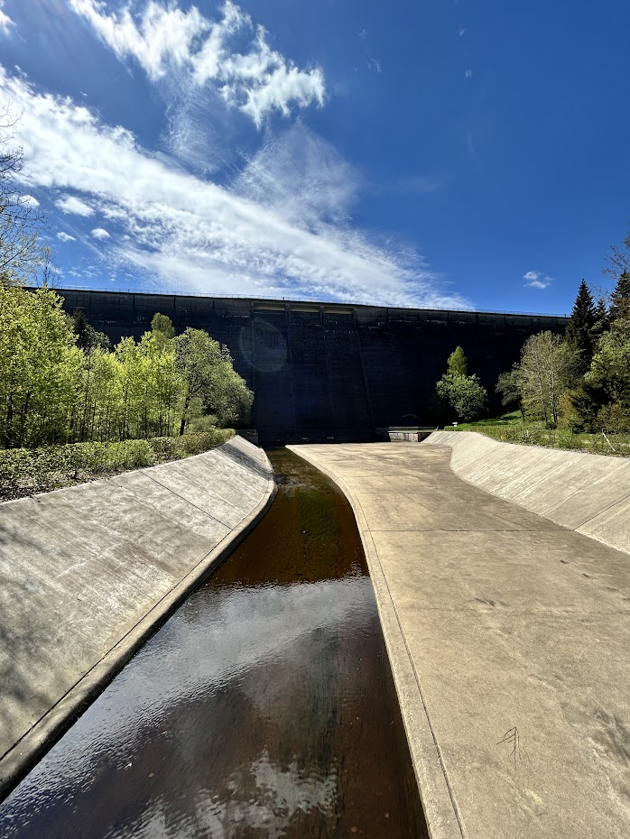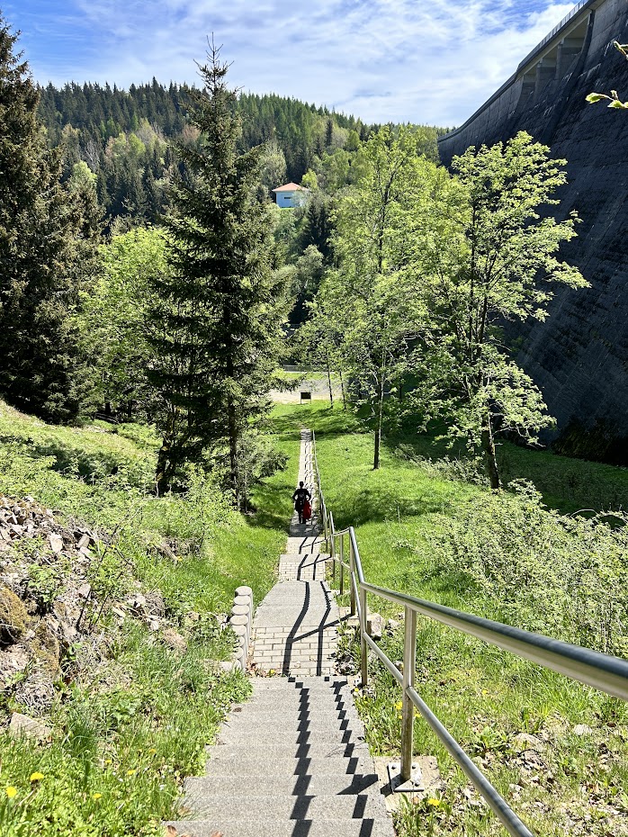 V létě roku 2024 byl zámeček v katastrofálním stavu, jak můžete vidět na fotkách. I když stojí na opravdu krásném místě na vrcholku mírného kopce. Místo má své kouzlo. My jsme pokračovali po lesní cestě dál. Cestou zpět k přehradě jsou hezké výhledy na okolní krajinu. Když dojdete zpět ke hrázi přehrady, můžete jít horem, což je pohodlnější. nNbo můžete sejít po schodech dolů jako my a vychutnat si odspodu pohled na mohutnou hráz. Ale schodů je opravdu hodně.