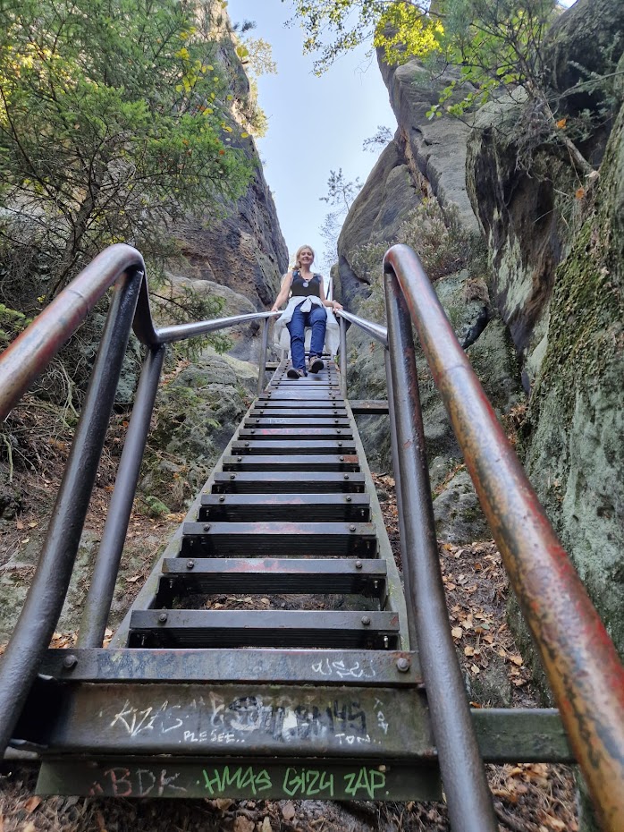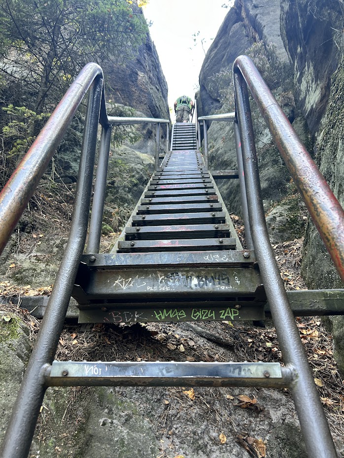 Kousek za rozcestím Vordere Promenade už začínají žebříky. Je to zdejší hlavní atrakce. Někdy jsou opravdu vysoké. Je z nich sice krásný výhled, ale kdo má závratě, úplně příjemné to není. Stojí to ovšem za zkoušku. Krásný zážitek a výhled na okolní přírodu Česko-saského Švýcarska stojí za to. My jsme po žebřících došli až na Gratweg. V překladu něco jako „cesta po horském hřebeni“. A je to doslova tak. Že je tady krásný výhled také asi nemusím zdůrazňovat. Pro tentokrát jsme tady naše putování ukončili.