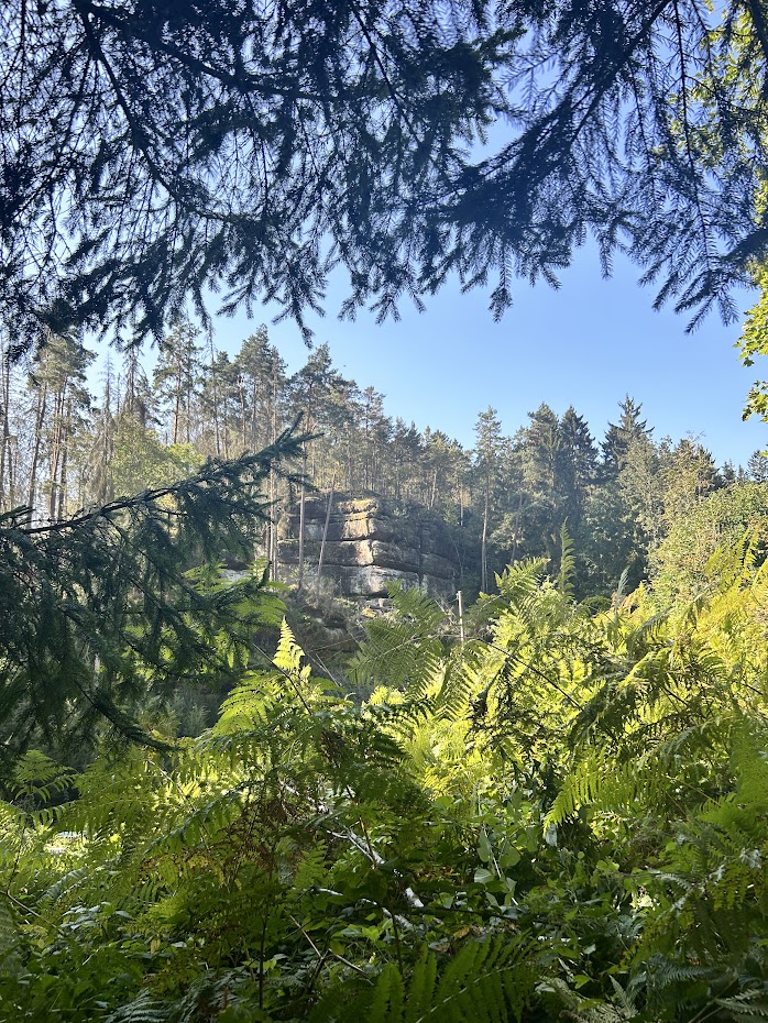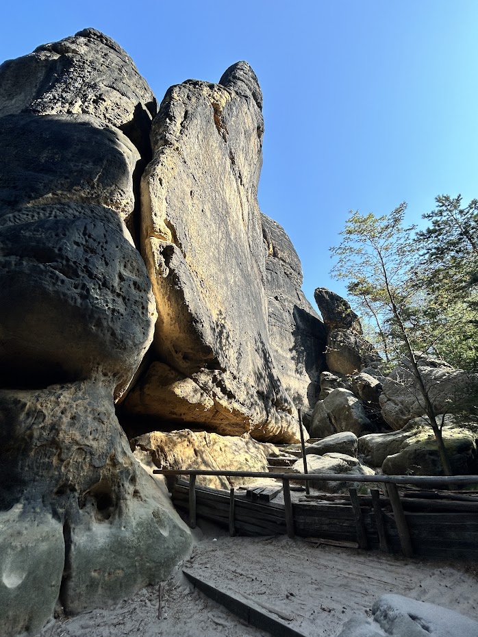 Když přejdete silnici, lesní pěšina začíná stoupat. Teď už vás pískovcové skály opravdu obklopují ze všech stran. Cesta je velmi hezká, skoro tajemná. Občas to vypadá, že odněkud určitě vyběhnou čerti. Je to jako brána do pekla. V době naší návštěvy bylo málo lidí, tak jsme si tyto pocity mohli krásně vychutnat.