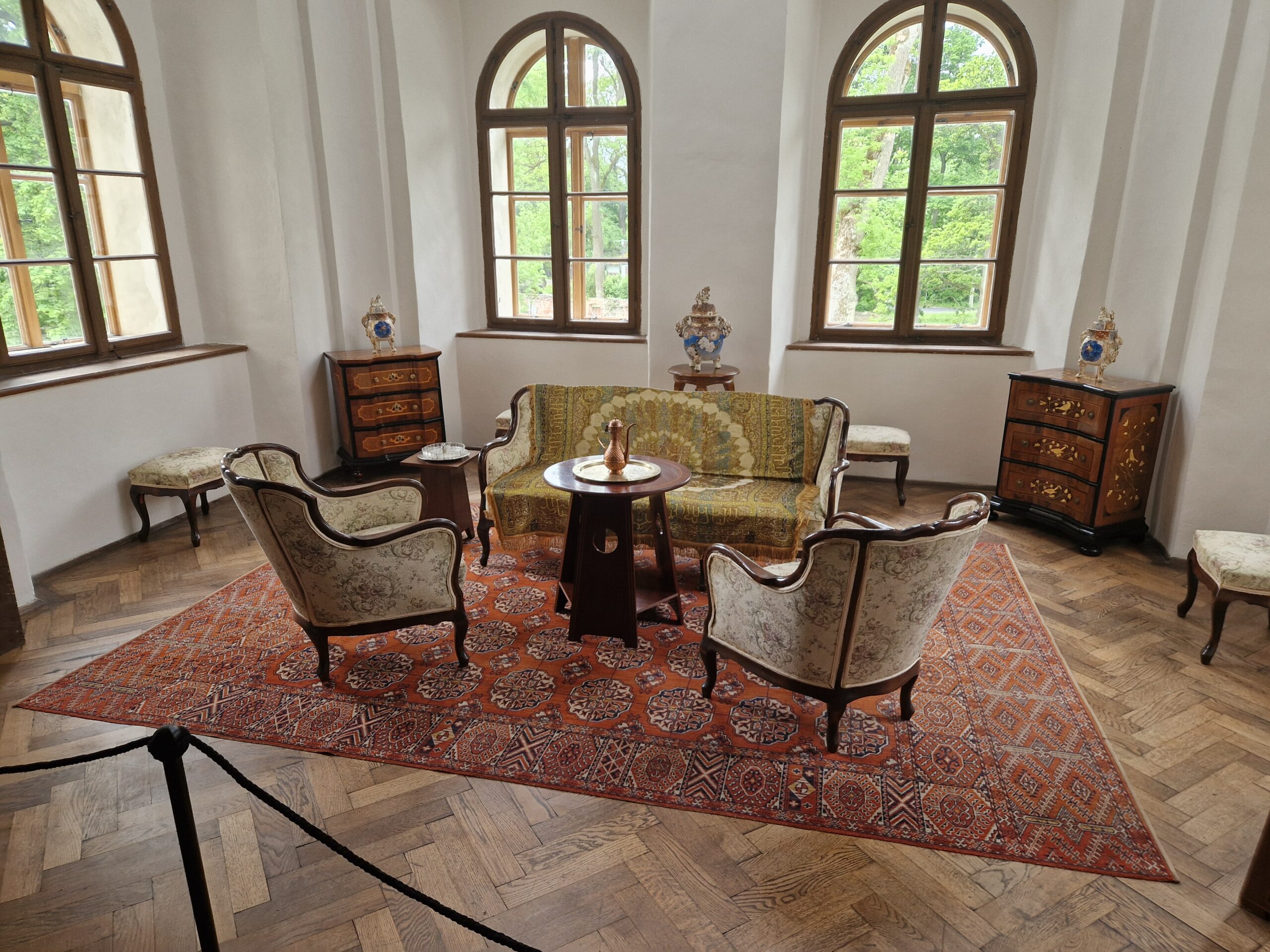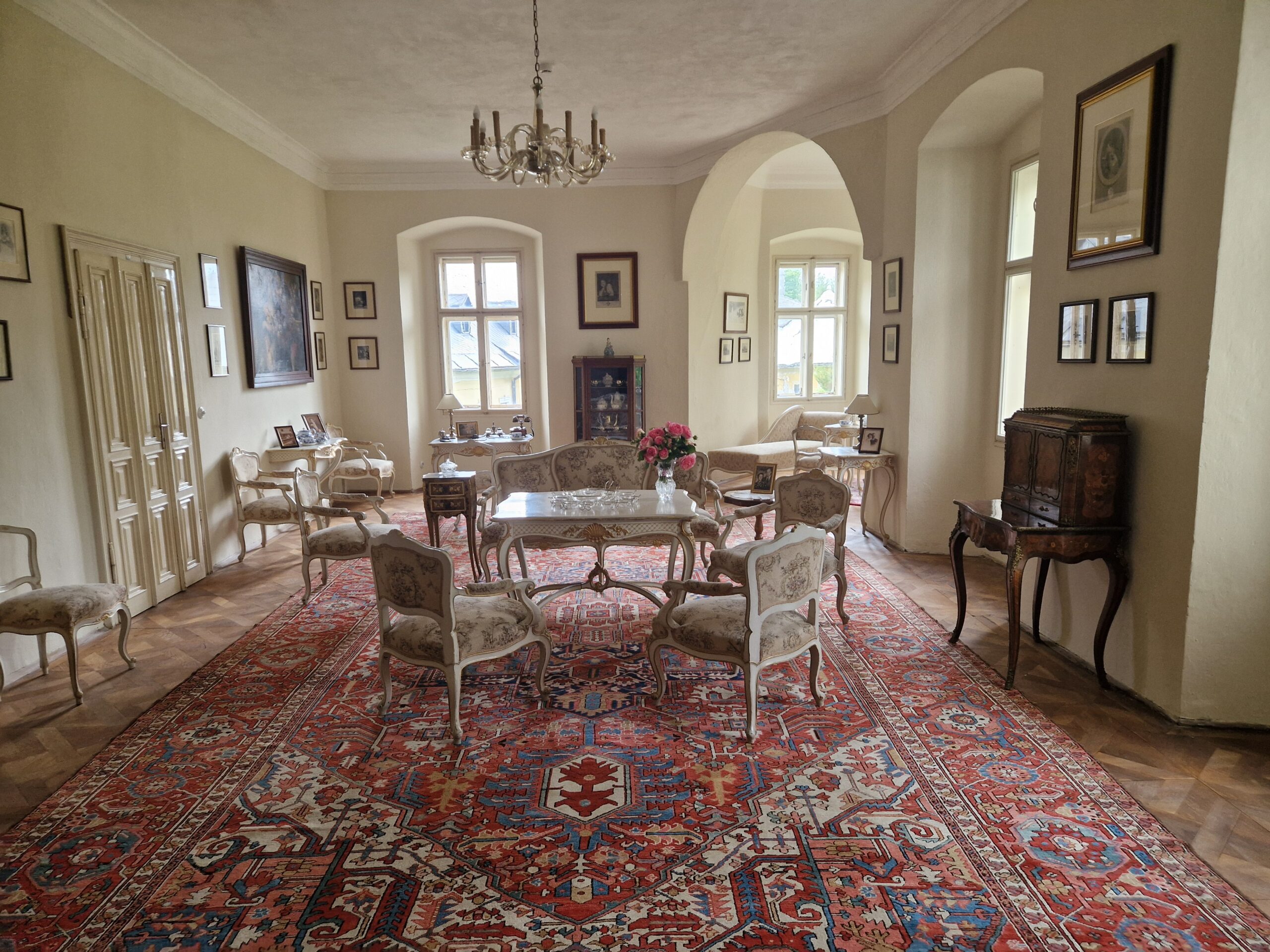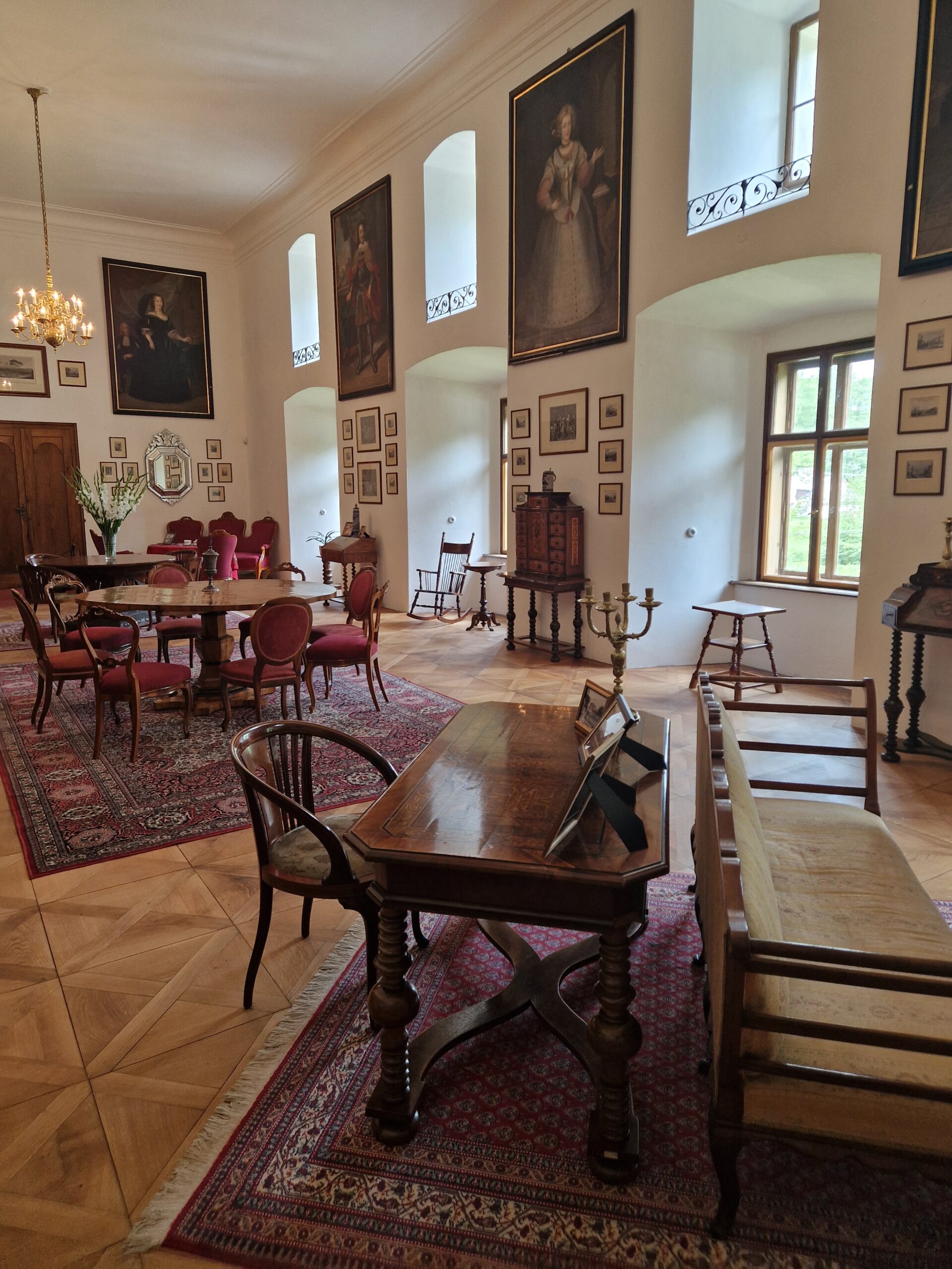 Jak je z fotografií vidět na první pohled, vnější fasáda je pořád ve špatném stavu. Tím se ale nenechte zmást. Uvnitř jsou už plnohodnotné zámecké interiéry, které za návštěvu určitě stojí. Interiér je koncipován tak, že je zde ukázka reálného interiéru z počátku 20. století, když tady bydlel hrabě František z Harrachu s rodinou a personálem.