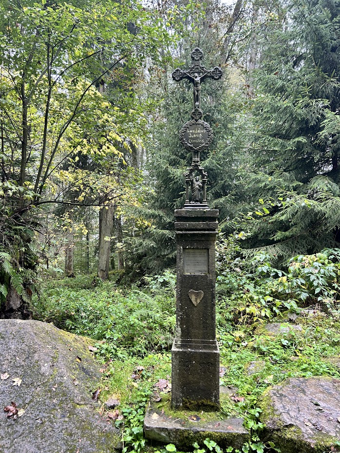 Tady cesta odbočí doleva a pokračuje jako úzká lesní pěšinka. Stoupání je již prudší, ale trvá jen necelého půl kilometru. Po pár minutách tedy máme již Stožeckou kapli před sebou.