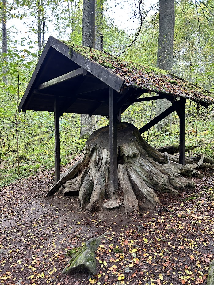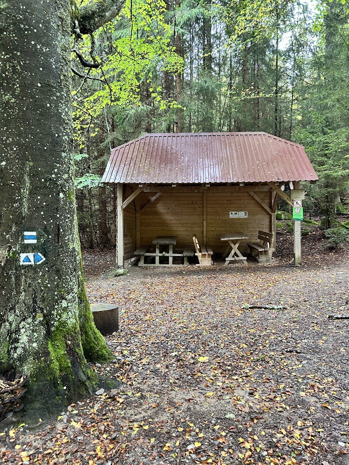 Po odbočení na modrou značku se cesta stává spíš lesní, než polní. Asi po necelých 2 km příjemné chůze do mírného kopce přijdeme k lesnímu přístřešku. Na české poměry se jedná o docela bytelnou konstrukci s kvalitní širokou střechou. Dokonce to bylo celé i docela čisté, což je obvyklé ještě méně. Takže příjemné místo k občerstvení.