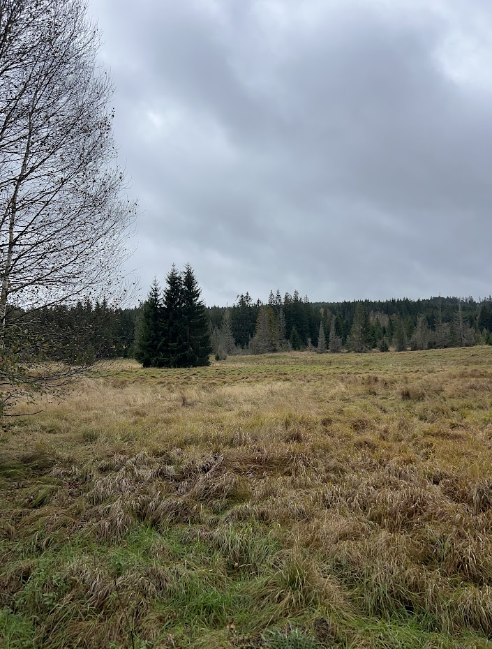 Tentokrát moc hezké počasí opravdu nebylo. Přesto jsme se nenechali odradit a na naši krátkou procházku vyrazili. Cesta začíná mezi poli a jde o klasickou polní traktorovou cestu. Ani za deště cesta rozbahněná nebyla. Tak jsme poměrně rychle došli až k rozcestí Stožecká luka.