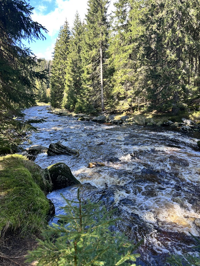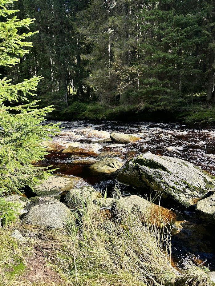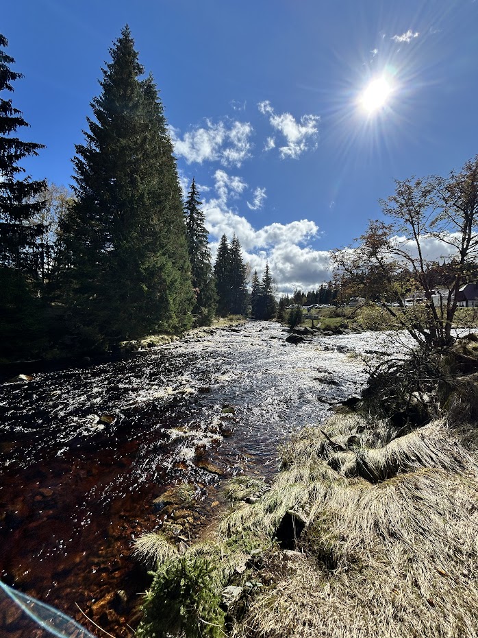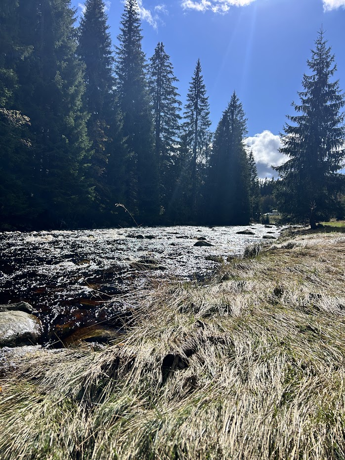 Prošli jsme obcí Modrava kolem několika restaurací a za mostem odbočili na menší parkoviště. Tam naučná stezka začíná. Po několika desítkách metrů narazíte na soutok dvou říček a je to opravdu krásný pohled. Pokračovali jsme dále kolem říčky Vydra a opravdu si užívali místní genuis loci. Okolní vzduch a příroda jsou pro člověka trávícího většinu života v centru Prahy opravdu boží.