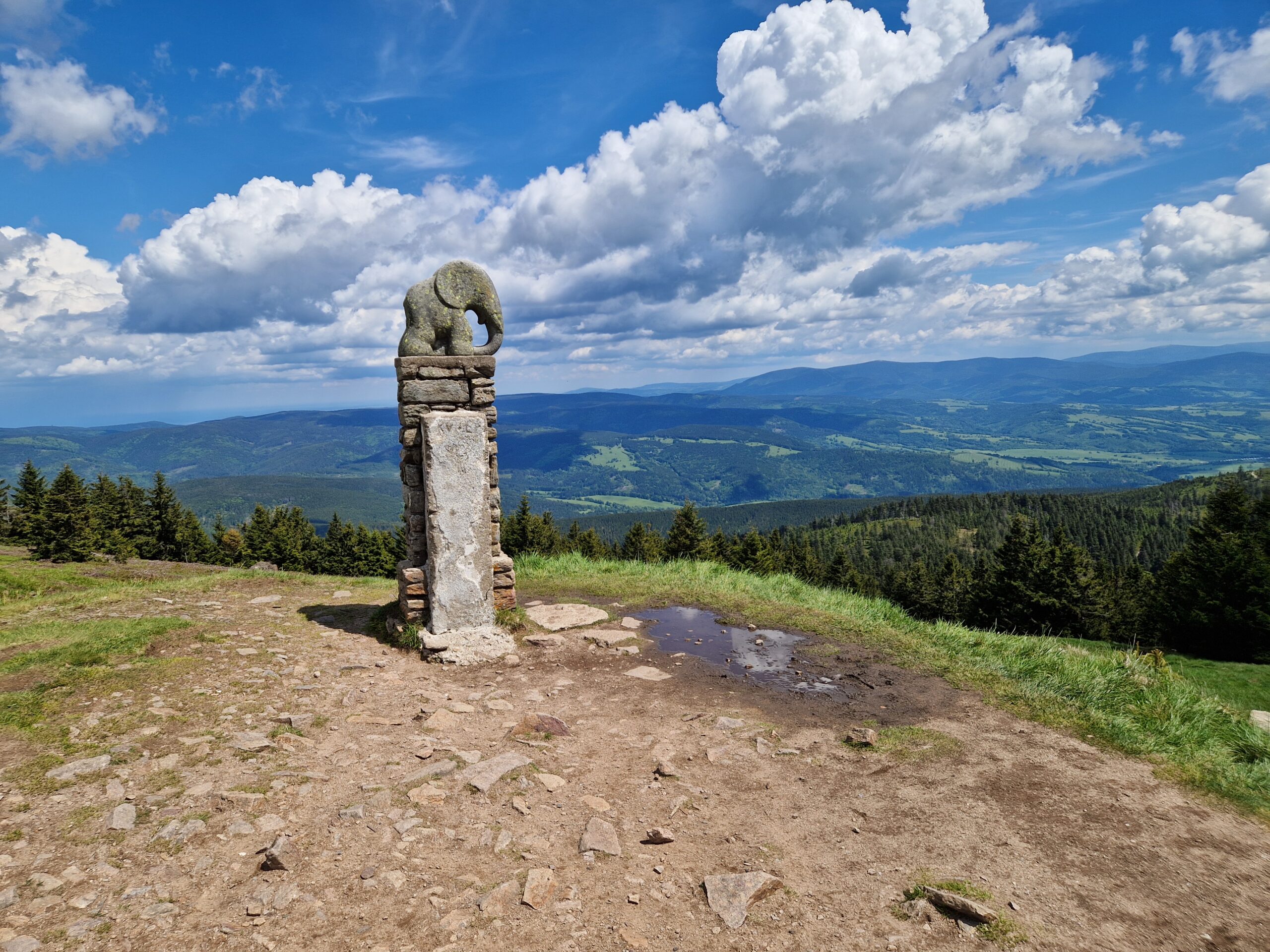 Tady se cesta zúží a stává víc kamenitou, proto je třeba tempo chůze zpomalit. Tak dojdeme po kamenité cestě až ke známé soše Slůněte, která byla postavena roku 1932. U té se všichni rádi fotí. Je to velmi hezké místo, opět s krásným výhledem. Když se vyfotíte, můžete pokračovat cestou k prameni řeky Moravy.