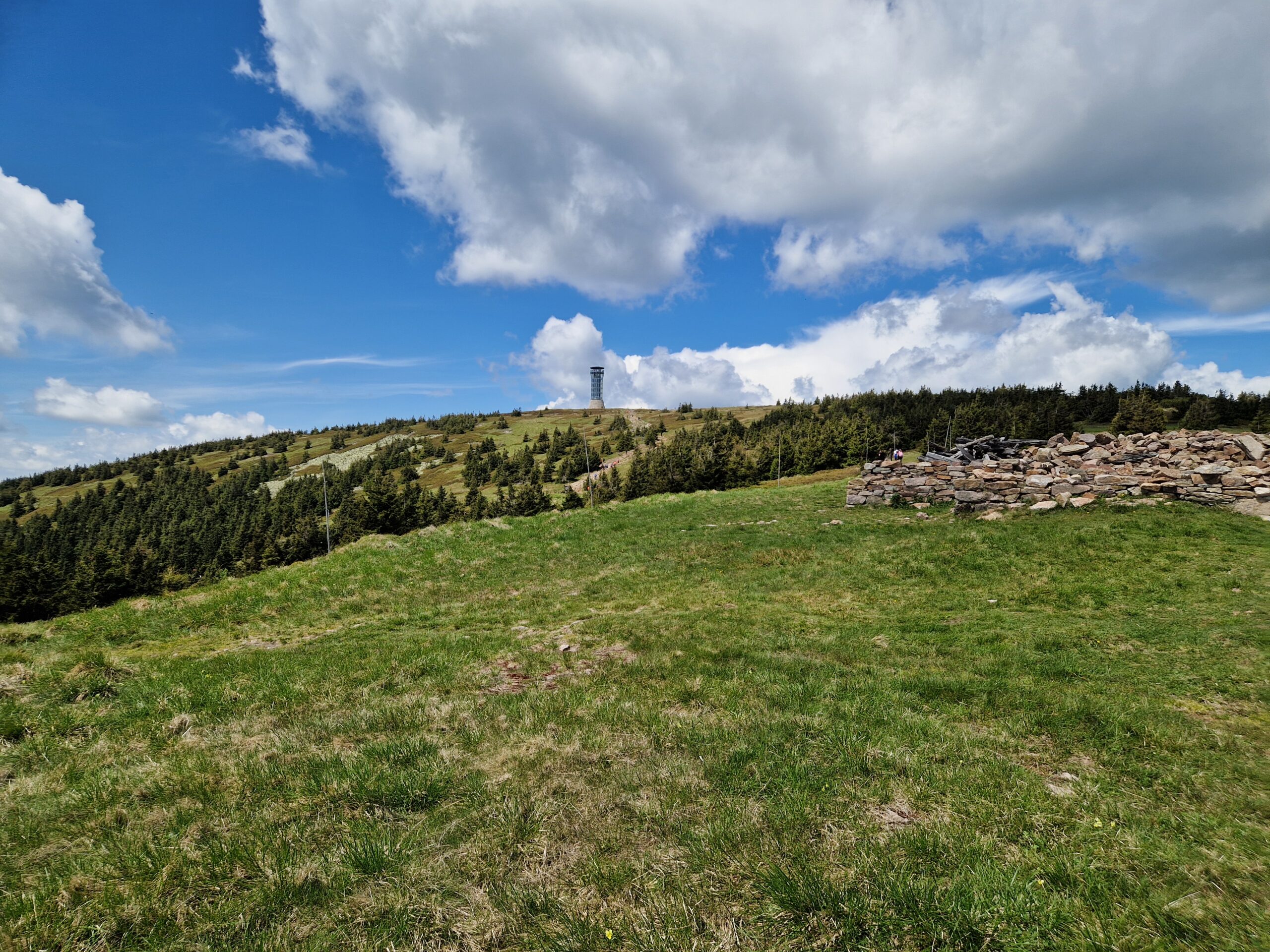 Tam dnes stojí na polské straně rozhledna, dostavěná v roce 2022, takže je opravdu nová. To byl náš dnešní cíl cesty. Kolem je množství větších kamenů, na které si lze sednout a kochat se nejen výhledem na polskou nebo moravskou stranu, ale také posvačit.