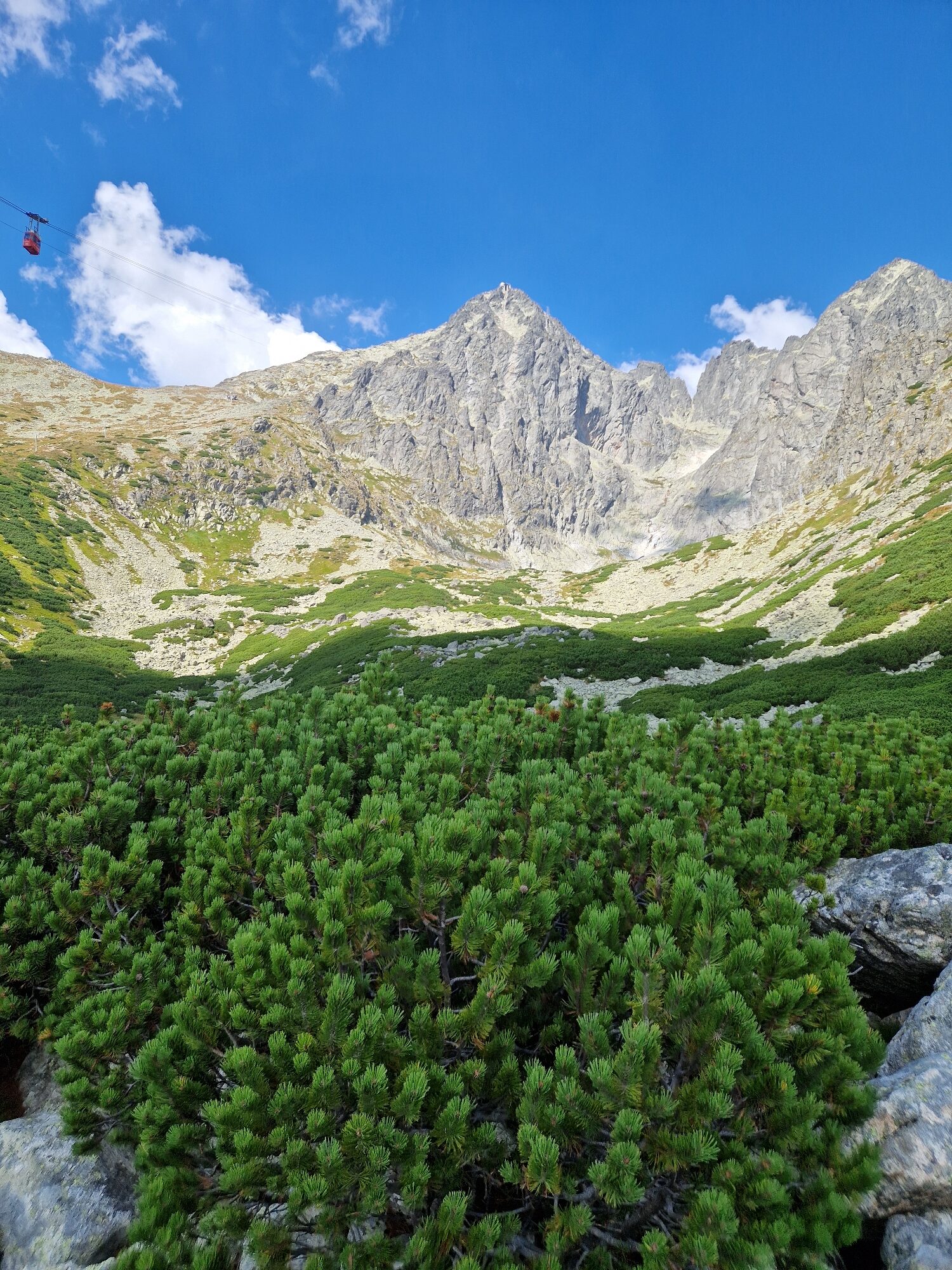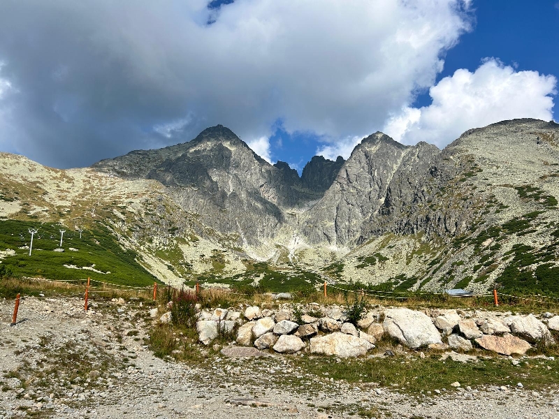 V tu chvíli končí les, začíná pásmo kosodřeviny. Již vidím na stanici lanovky Skalnaté pleso a vím, že nahoru mám ještě kus cesty. Před sebou vidím kamenné pole, po kterém budu muset strmě vystoupat. Šplhám po kamenném poli a stanice lanovky se moc nepřibližuje. Nakonec se napojím na červeně značenou Tatranskou magistrálu. Po chvíli dojdu ke Skalnaté chatě, kde si můžete dát občerstvení. A také se kochat téměř neskutečným výhledem jak na Lomnický štít, tak i do údolí. Odtud už je to ke Skalnatému plesu opravdu kousek.