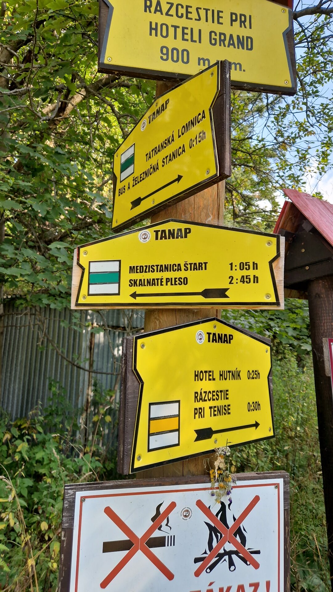 Začínám na rozcestí za parkovištěm Grandhotelu Praha, což je v Tatranské Lomnici výborný výchozí a orientační bod. Turistická šipka ukazuje, že bych měl zvládnout cestu za 2 hodiny a 45 minut. Při plánování cest počítám, že každou hodinu ujdu 6 km. Dobře se to počítá, prostě 1 km každých 10 minut. Tak jsem před tím rozcestníkem stál a říkám si, že to asi bude nějaký omyl. Necelých 6 km skoro 3 hodiny. Není to trochu moc? No uvidíme.