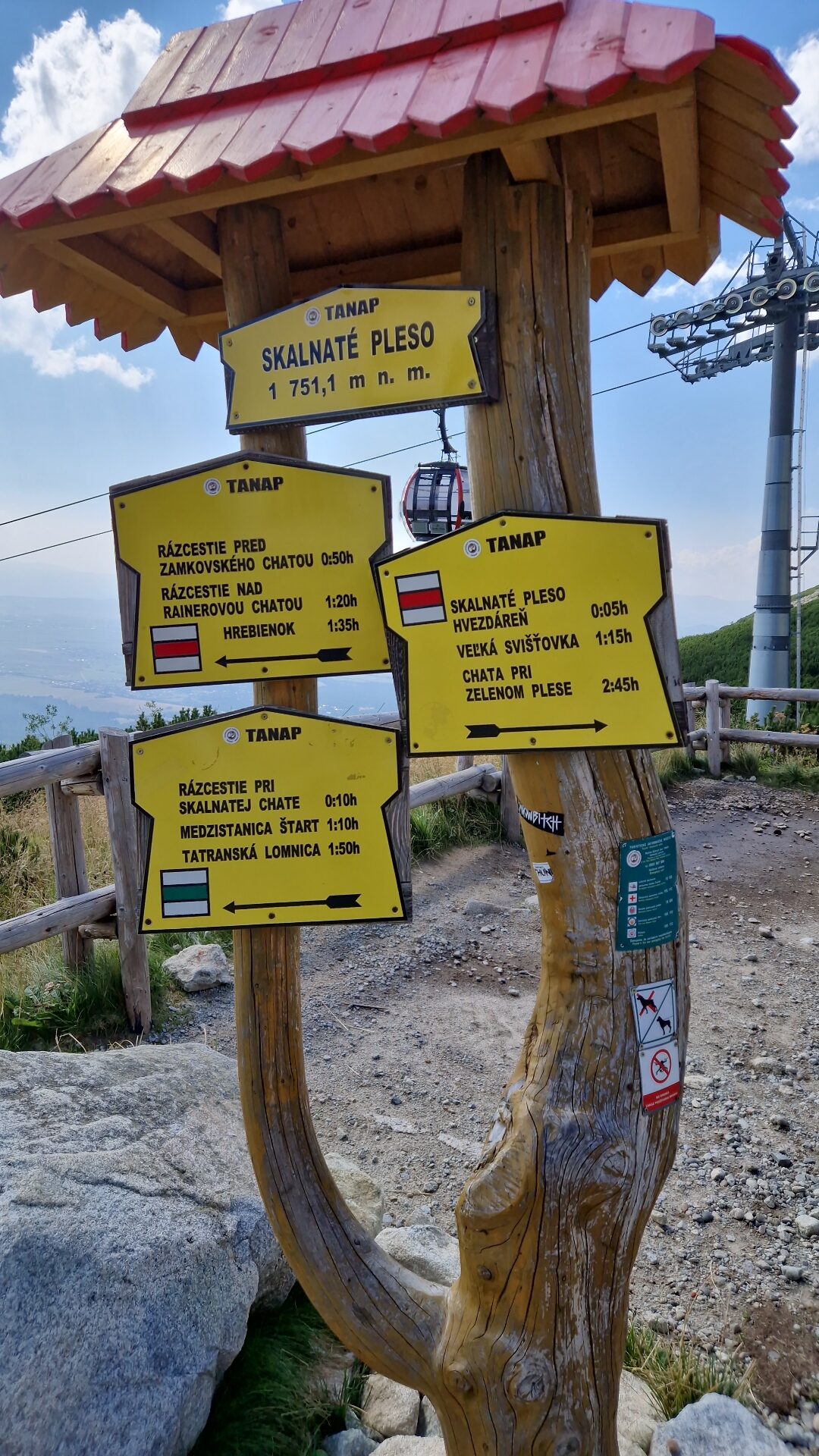 Stojím před turistickým rozcestníkem Skalnaté pleso. Celá cesta od Grandhotelu Praha mi trvala 1 hodinu a 40 minut. Takže jsem „předběhl“ turistické značení přesně o hodinu, ale byla to opravdu fuška. Ve slovenských horách jsou turistické informace udávány v časech předpokládané chůze, ne v kilometrech jako u nás. Je to logické. Při této túře vzdálenost také podstatná nebyla.