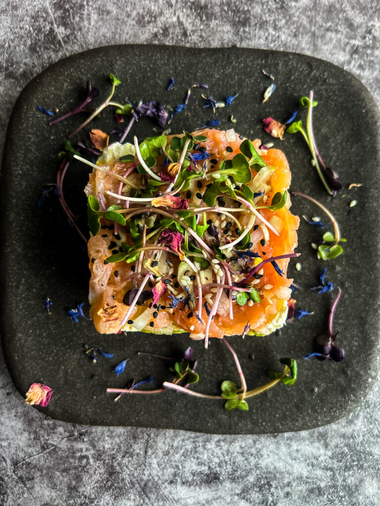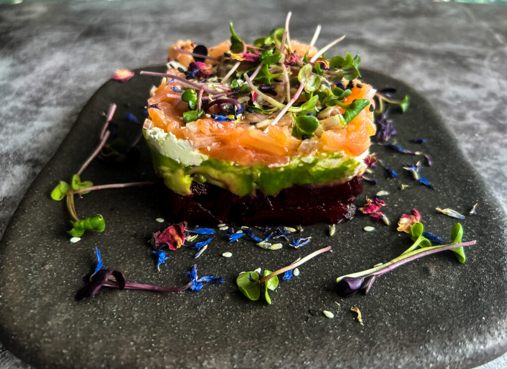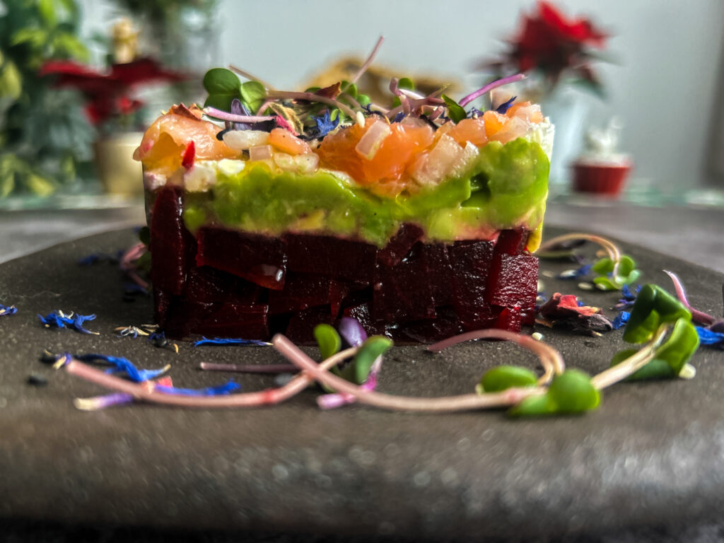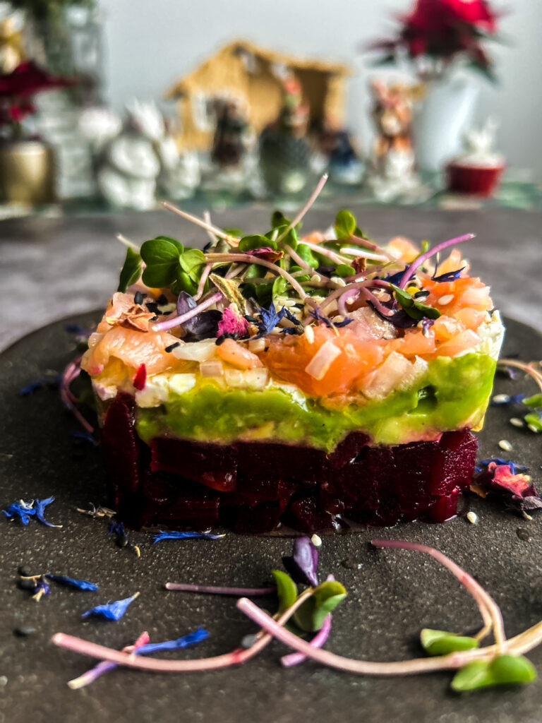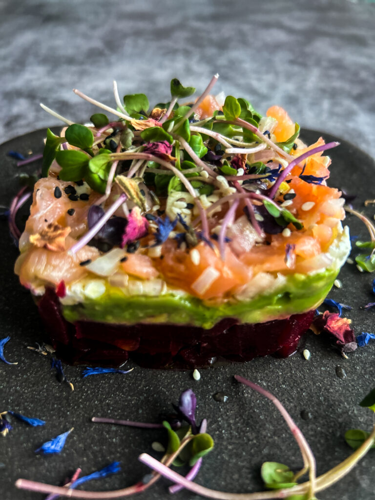- Vyberte si oblíbený tvar formičky na foodstyling a začněte postupně vrstvit: červenou řepu, avokádo, čerstvý sýr a nakonec lososa. Každou vrstvu vždy dobře stlačte. Nakonec polijte dresinkem, posypte mikrobylinkami a sezamem, sundejte formu. Talíř můžete ozdobit sušenými nebo čerstvými jedlými květy.