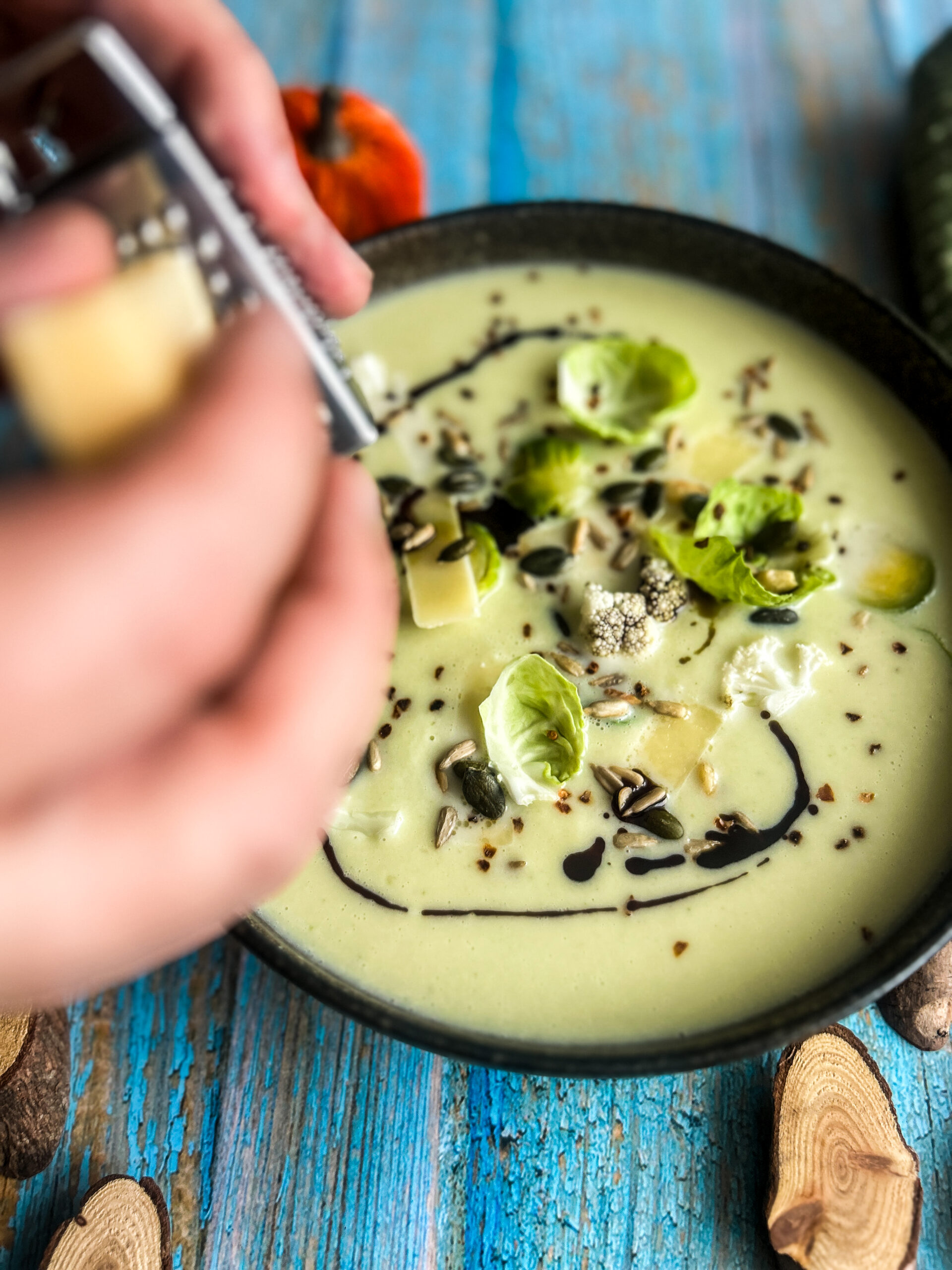 Po uvaření košťálů (cca 30 minut) rozmixujte pevné části dohladka. Dejte znovu vařit na malý plamen, přidejte smetanu, trochu másla, drcená sušená rajčata a chuťově dolaďte. Provařte asi 10 minut. Každou porci ještě s trochou másla prošlehejte metličkou (není nutné) a vlijte do talíře. Na dozdobení (ale hlavně dochucení – samotná polévka je totiž trochu mdlá) použijte kousky růžičkové kapusty včetně několika čerstvých lístků, kousky čerstvého květáku, sušené bylinky, hoblinky parmezánu, čerstvý pepř a pár kapek kvalitního oleje (mně se osvědčil dýňový).