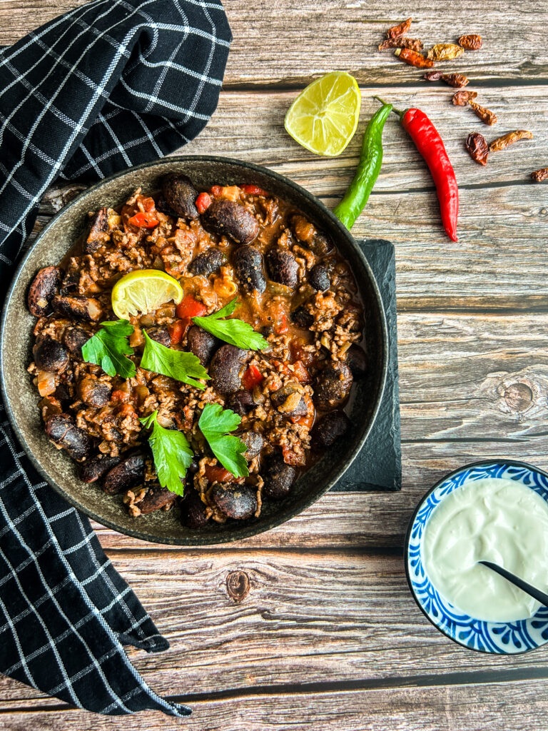Luštěniny jsou jedna z nejzdravějších potravin. Obsahují bílkoviny (i když nekompletní), důležité minerály a vlákninu. Hovězí maso, zejména pokud je z dobrého zdroje, je výbornou surovinou obsahující důležité živiny. Rajčata v konzervě jsou velmi dobrá nejen chuťově, ale i pro obsah lykopenu. Některé zdroje uvádějí, že lykopen z tepelně upravených rajčat se v těle vstřebává lépe než z rajčat syrových. Koření spolu s cibulí a česnekem dodává další antioxidanty.