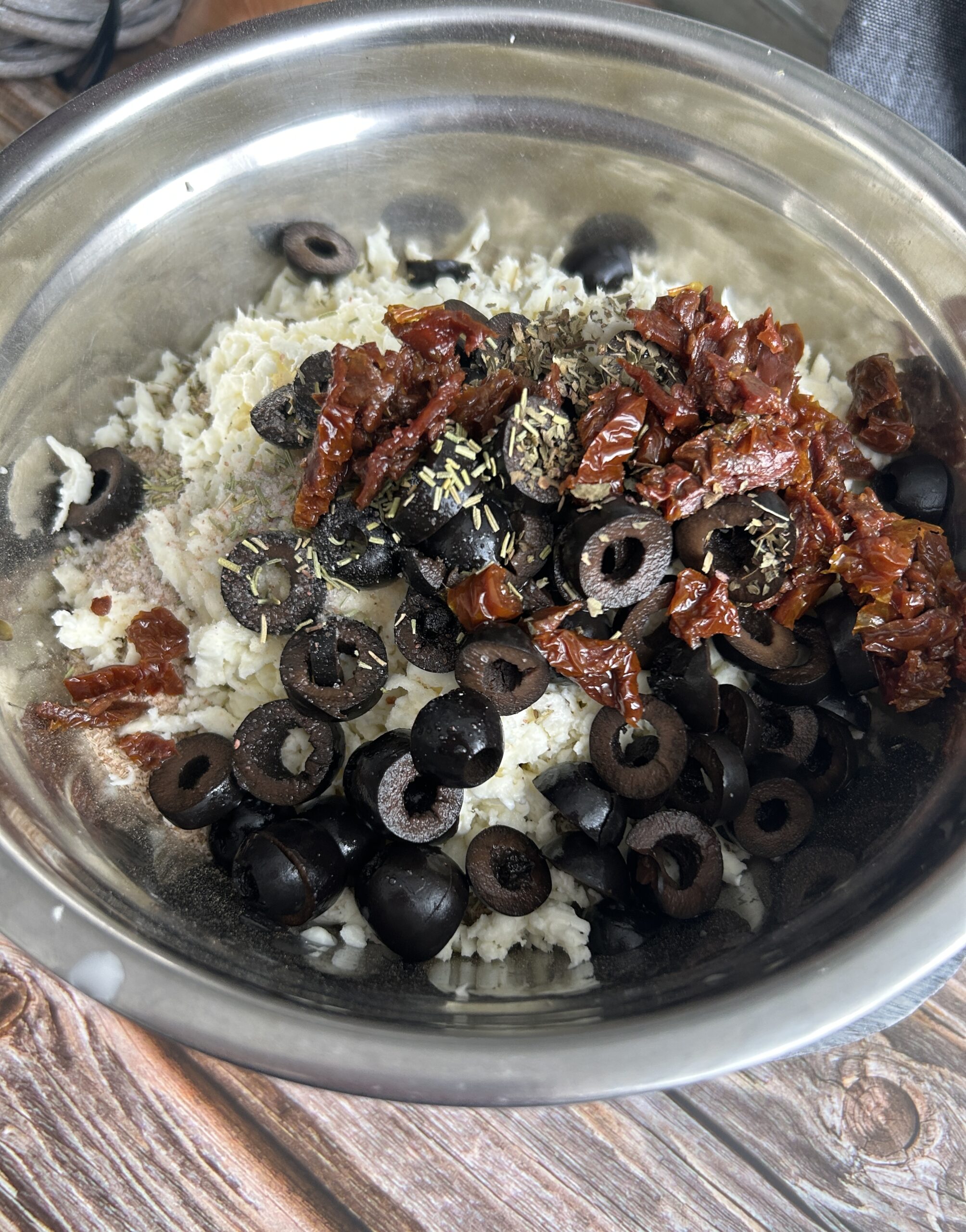 - Ve větší míse smícháme všechny suché suroviny a strouhaný sýr.