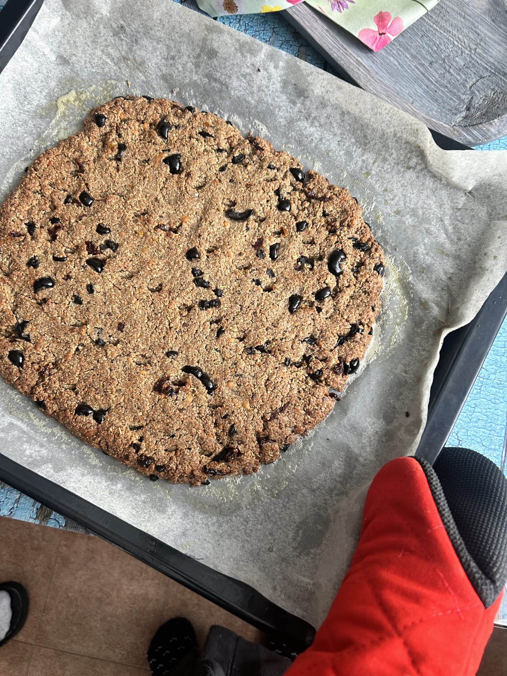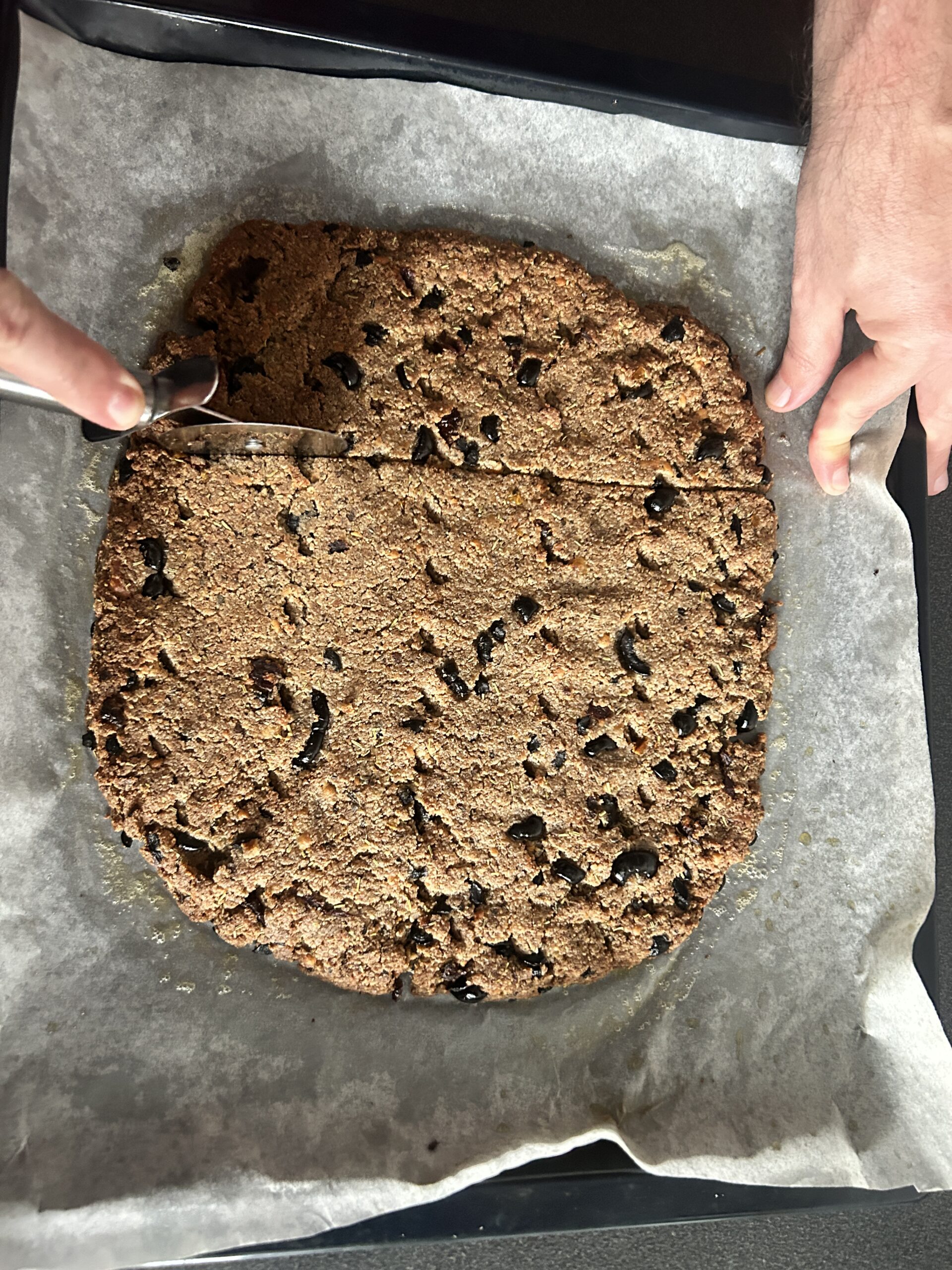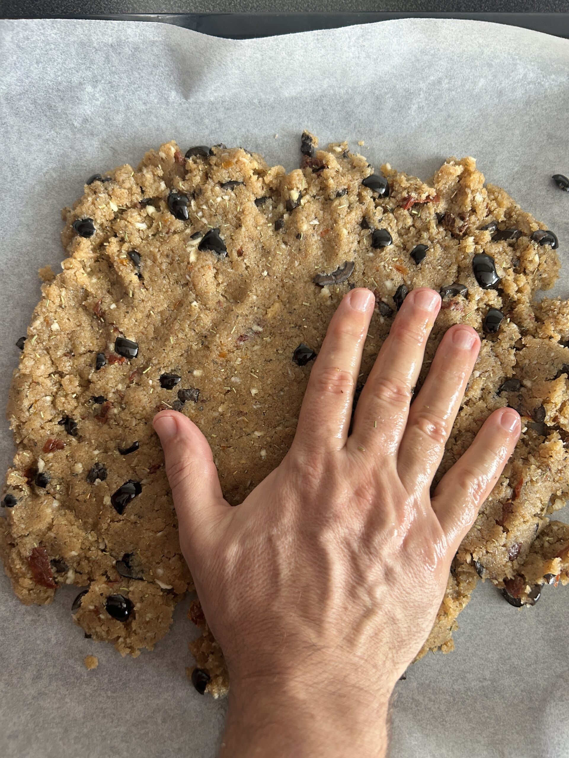 - Na plech dáme pečící papír a těsto rozprostřeme, aby bylo silné cca 1 cm. Počítejte s tím, že je to trochu jiná práce než s klasických těstem z pšeničné mouky.
